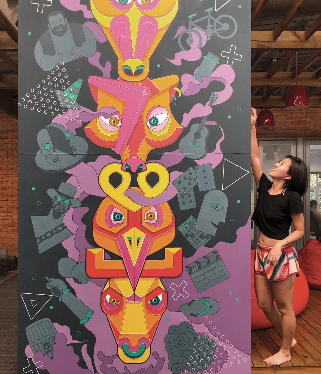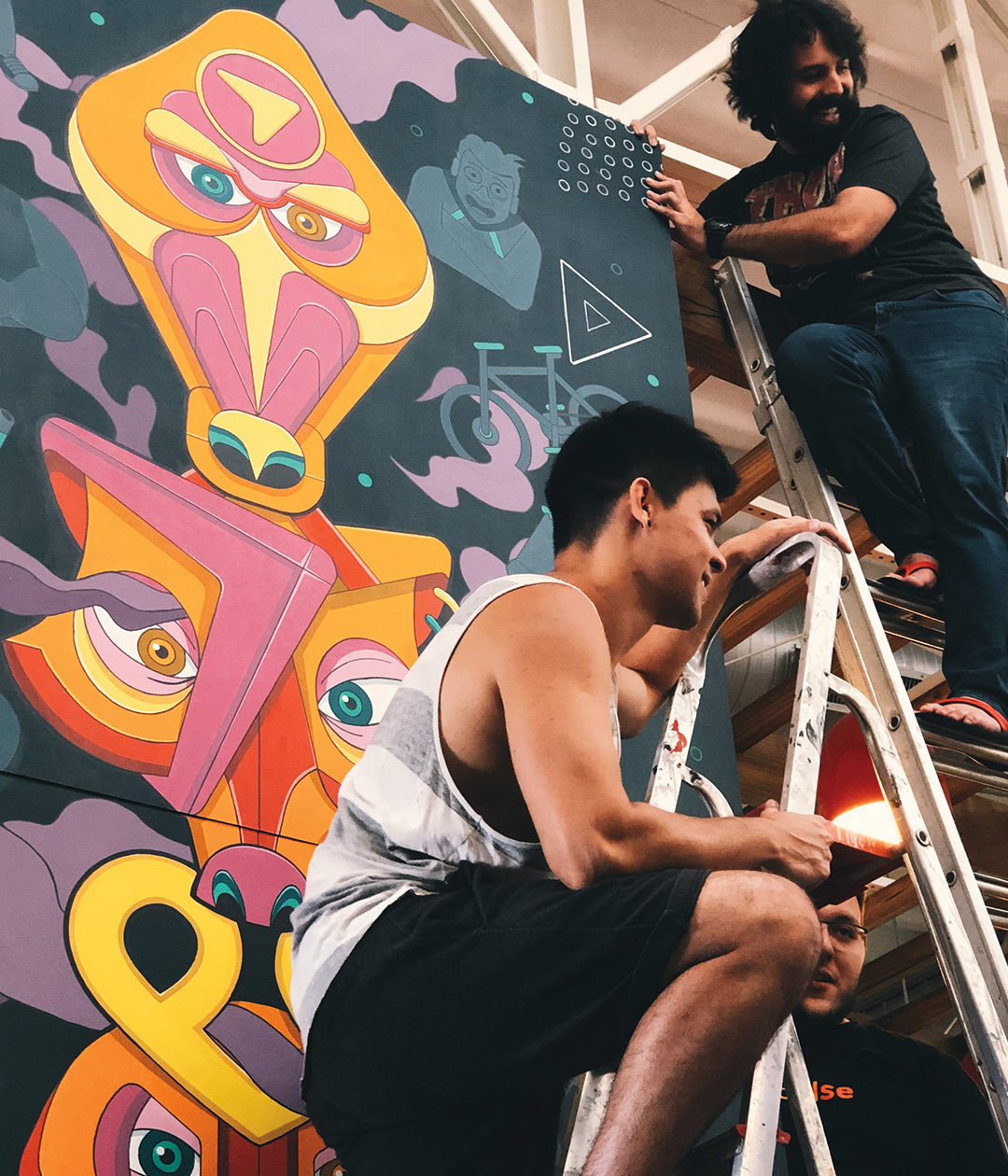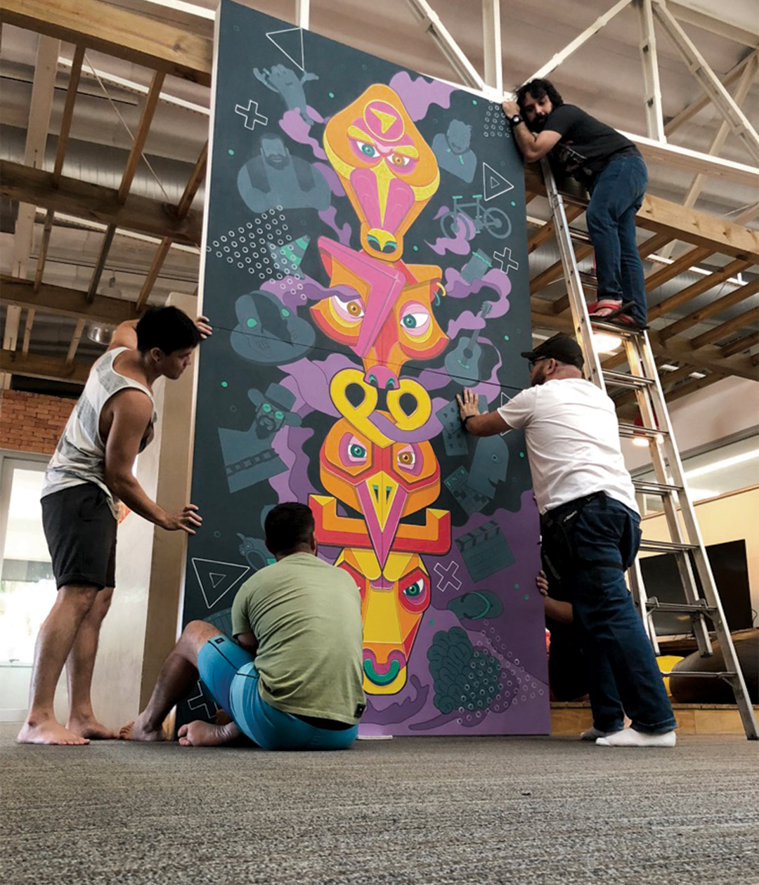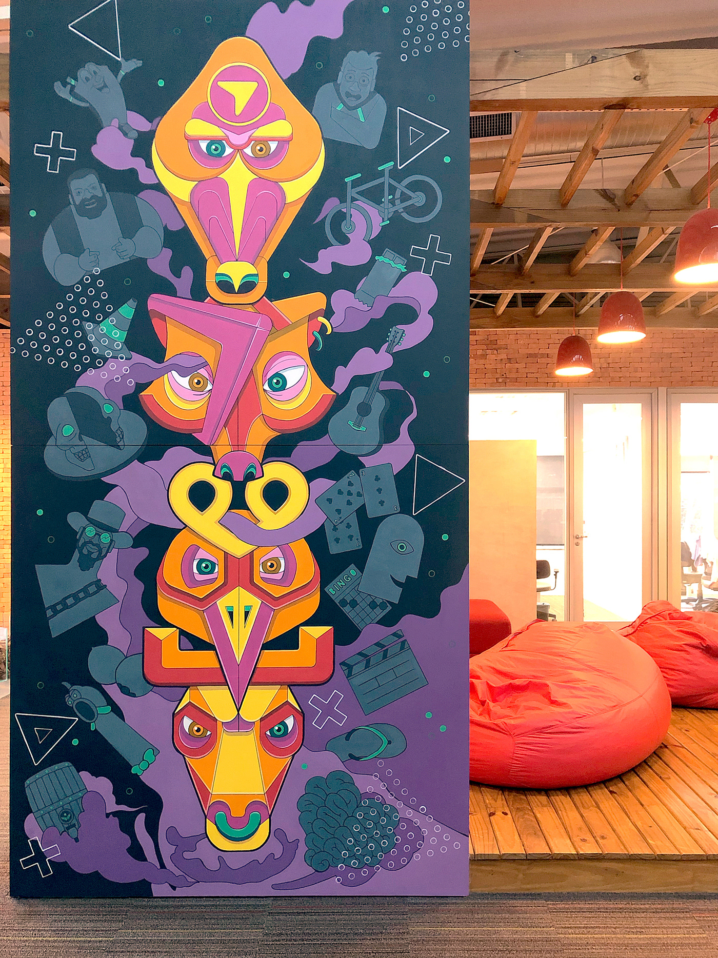 invited us to create a panel that should represent a very important moment in their business. By that time the company was gathering four start-ups and the painting should represent each one's essences getting together.